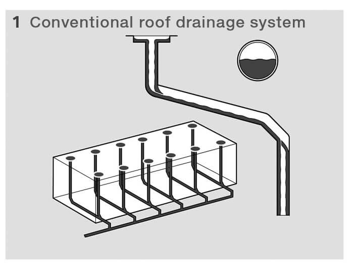 While conventional systems simply allow rain to run off through sloping pipes, the compact Geberit Pluvia syphonic roof drainage system pipe fills up quickly and extracts the rainwater from the roof using the resultant negative pressure. The Geberit Pluvia roof outlets prevent air from being sucked in and guarantee reliable performance.